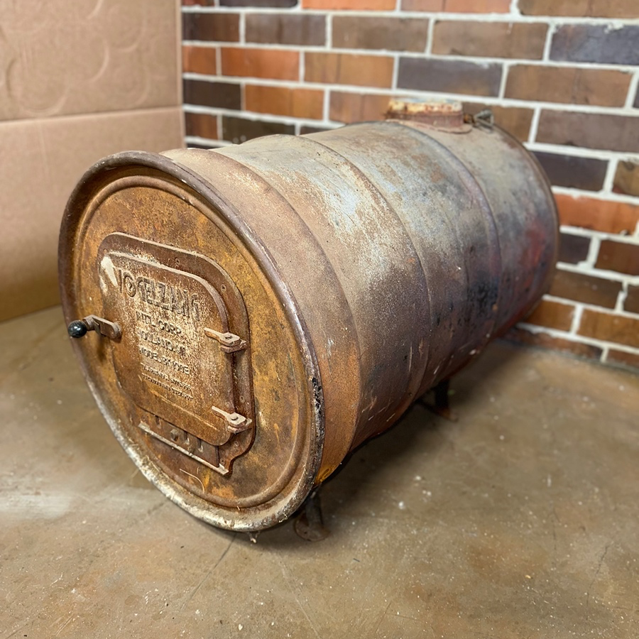 Rustic vintage wood-burning stove from early to mid-20th century. Ideal for cabins or industrial-themed spaces.