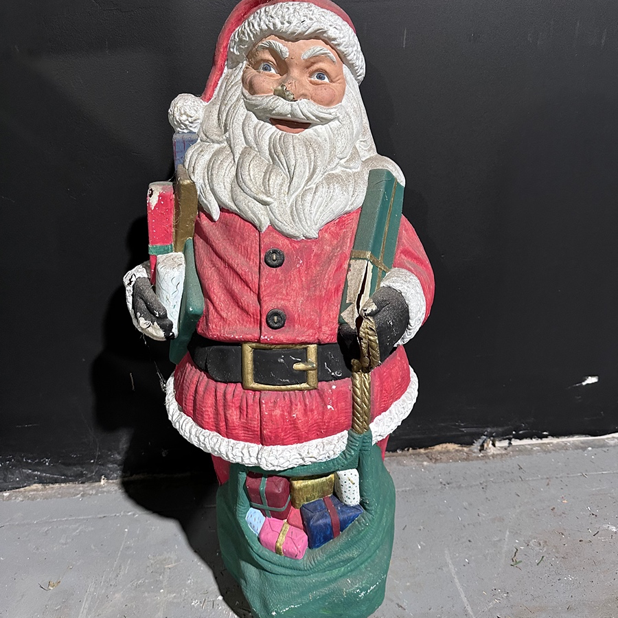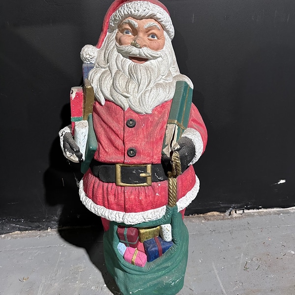 Charming Santa paper machedecoration, ideal for festive Christmas displays. Vibrant red, green, and white colors.